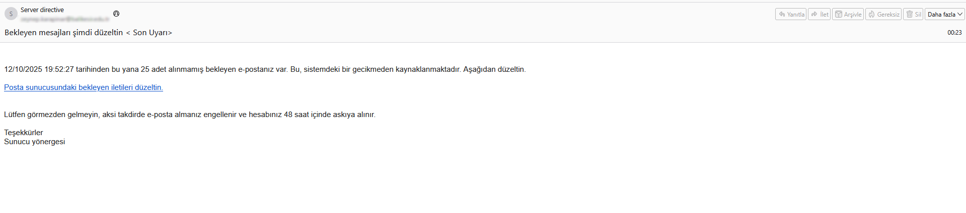 Çeşitli tarihlerde gönderilen aşağıdaki resimdeki e-posta’yı alan tüm personel ve öğrencilerimizin eposta içerisinde bildirilen bağlantıya tıklamadan silmeleri gerekmektedir.