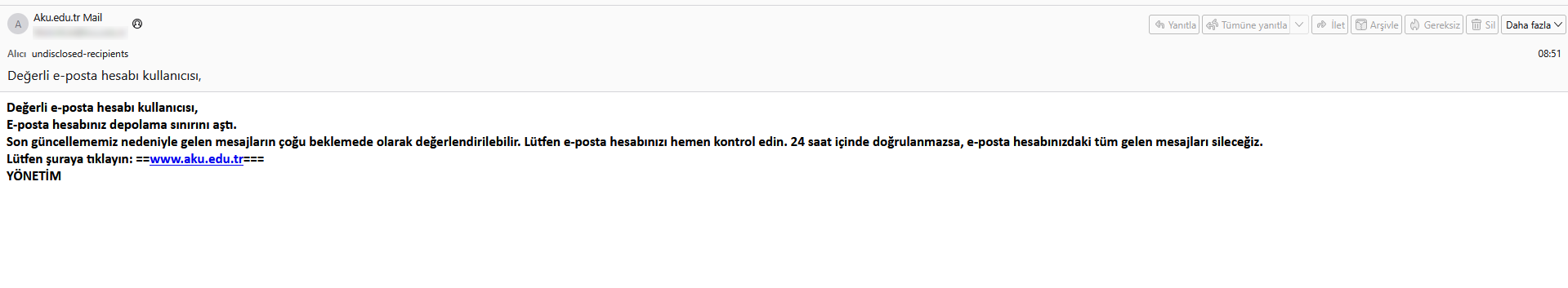 Çeşitli tarihlerde gönderilen aşağıdaki resimdeki e-posta’yı alan tüm personel ve öğrencilerimizin eposta içerisinde bildirilen bağlantıya tıklamadan silmeleri gerekmektedir.