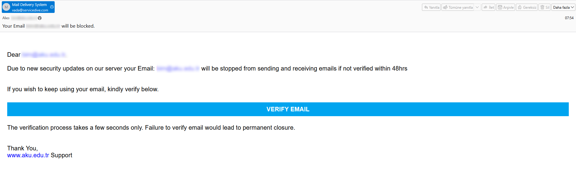 Çeşitli tarihlerde gönderilen aşağıdaki resimdeki e-posta’yı alan tüm personel ve öğrencilerimizin eposta içerisinde bildirilen bağlantıya tıklamadan silmeleri gerekmektedir.